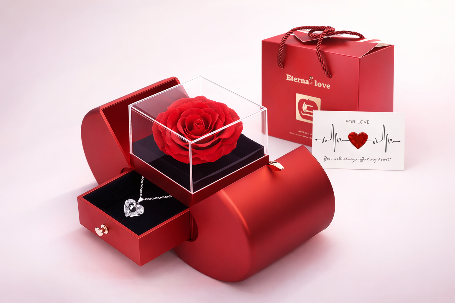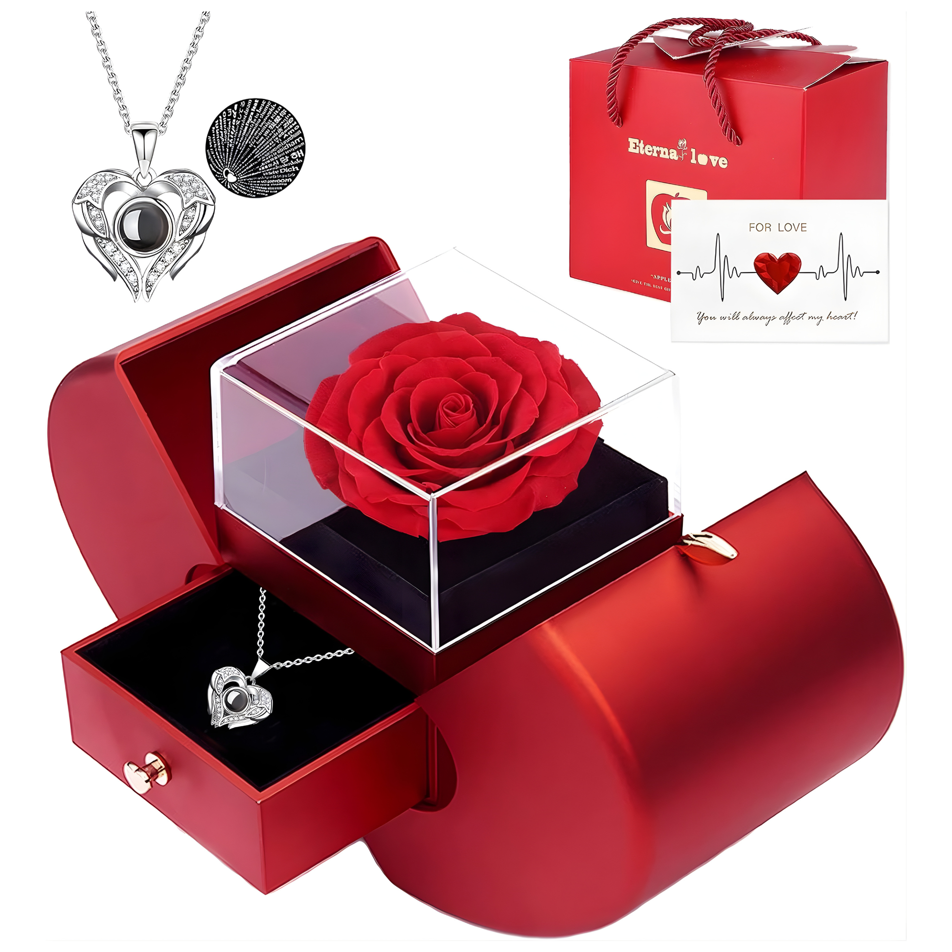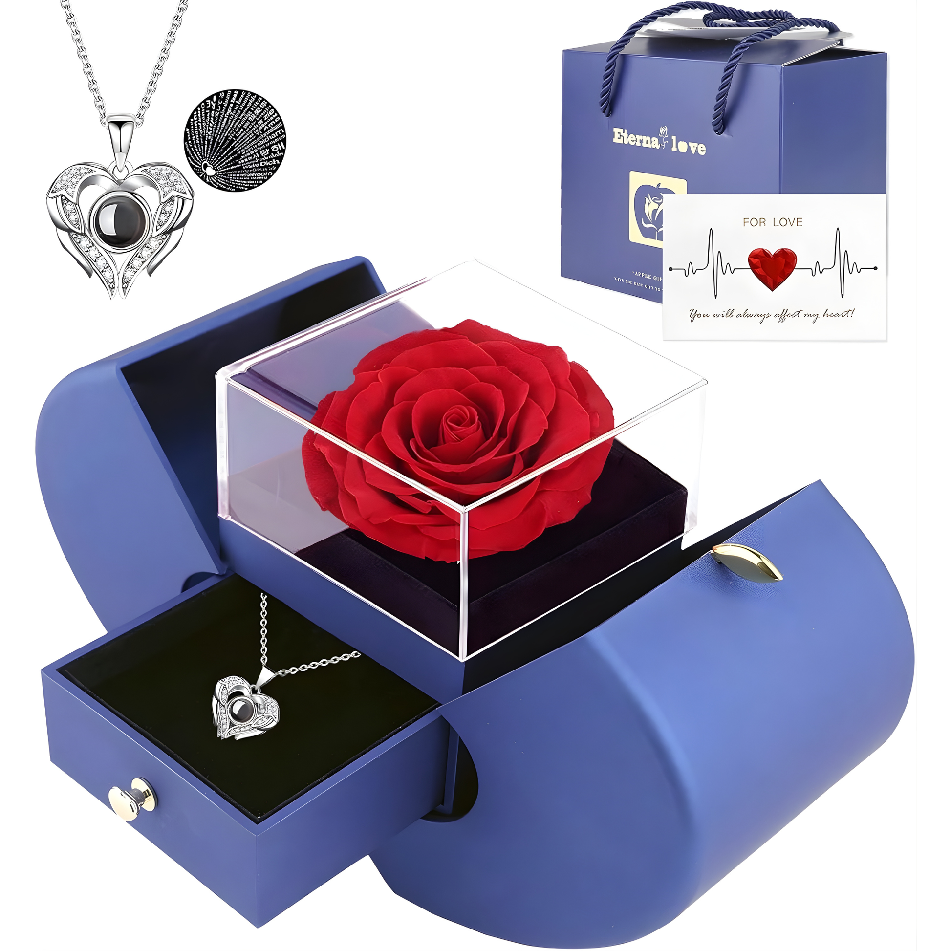 Este set de regalo con rosa real preservada incluye una hermosa rosa que nunca se marchita y un collar con “Te Amo” en 100 idiomas, convirtiéndose en un símbolo eterno de amor verdadero.