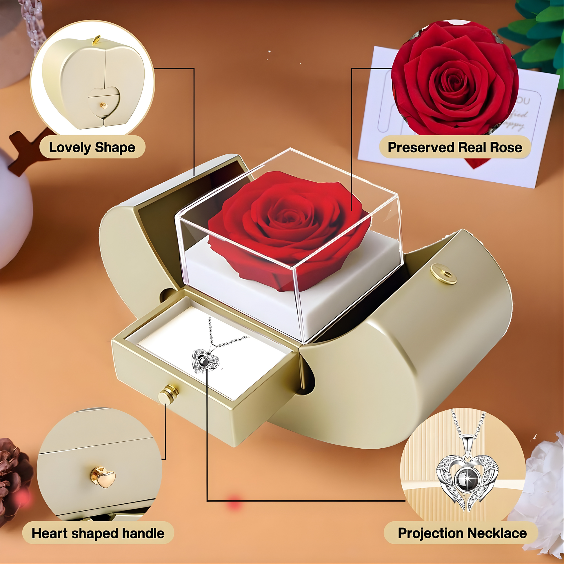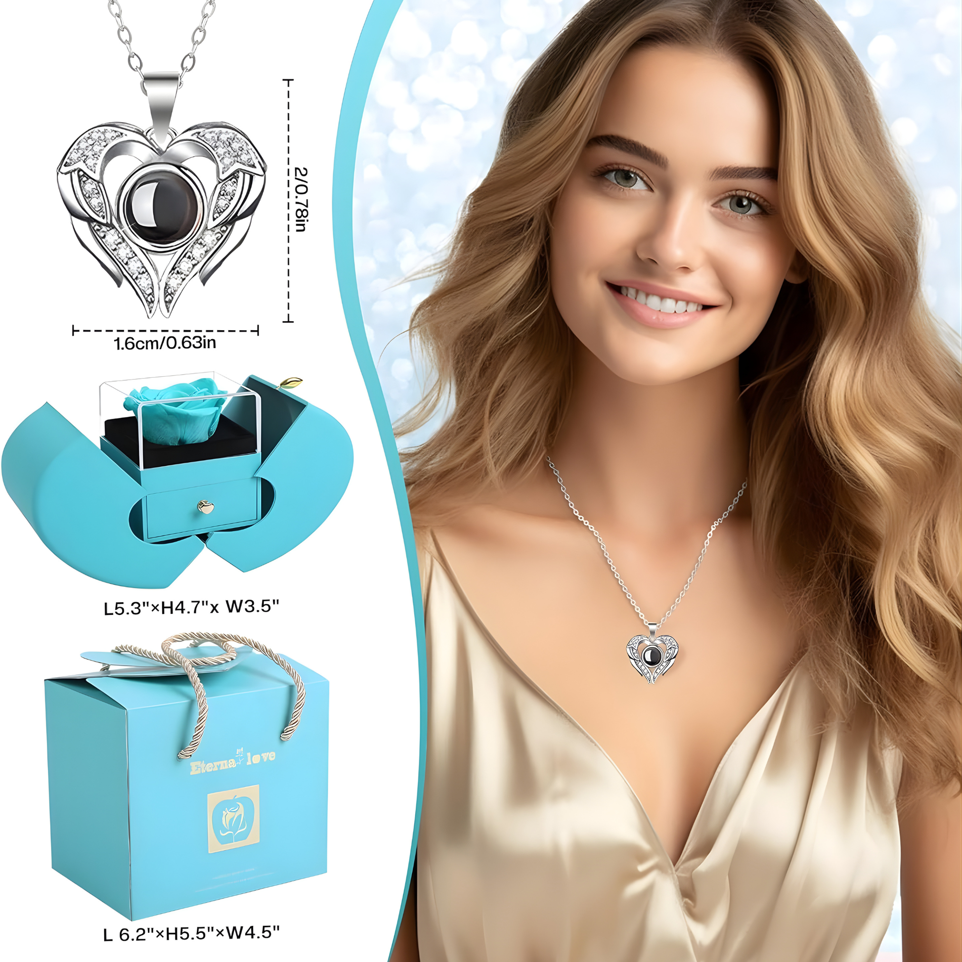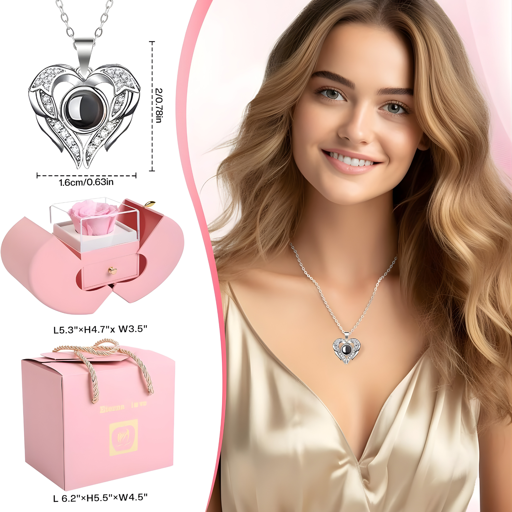 Este set de regalo con rosa real preservada incluye una hermosa rosa que nunca se marchita y un collar con “Te Amo” en 100 idiomas, convirtiéndose en un símbolo eterno de amor verdadero.