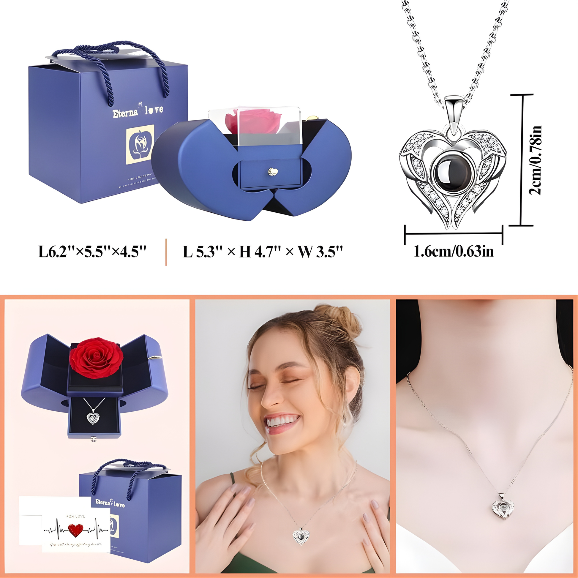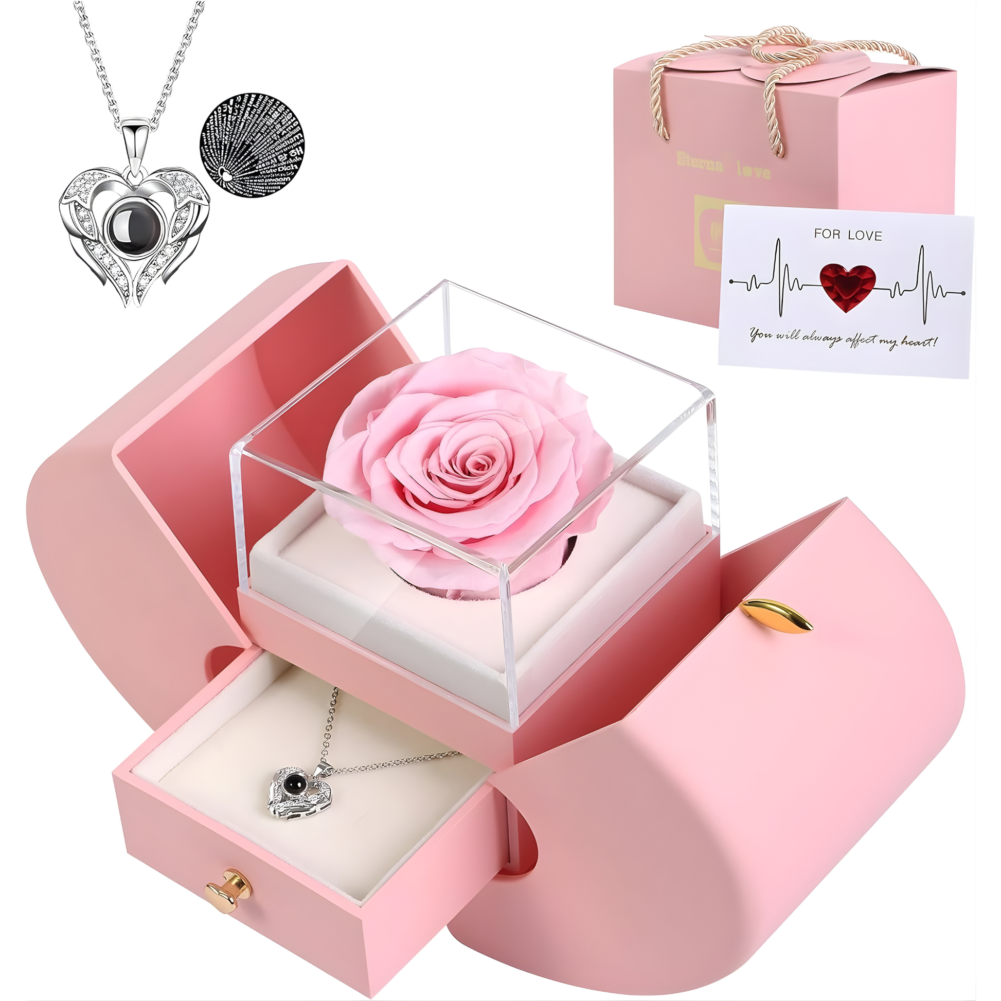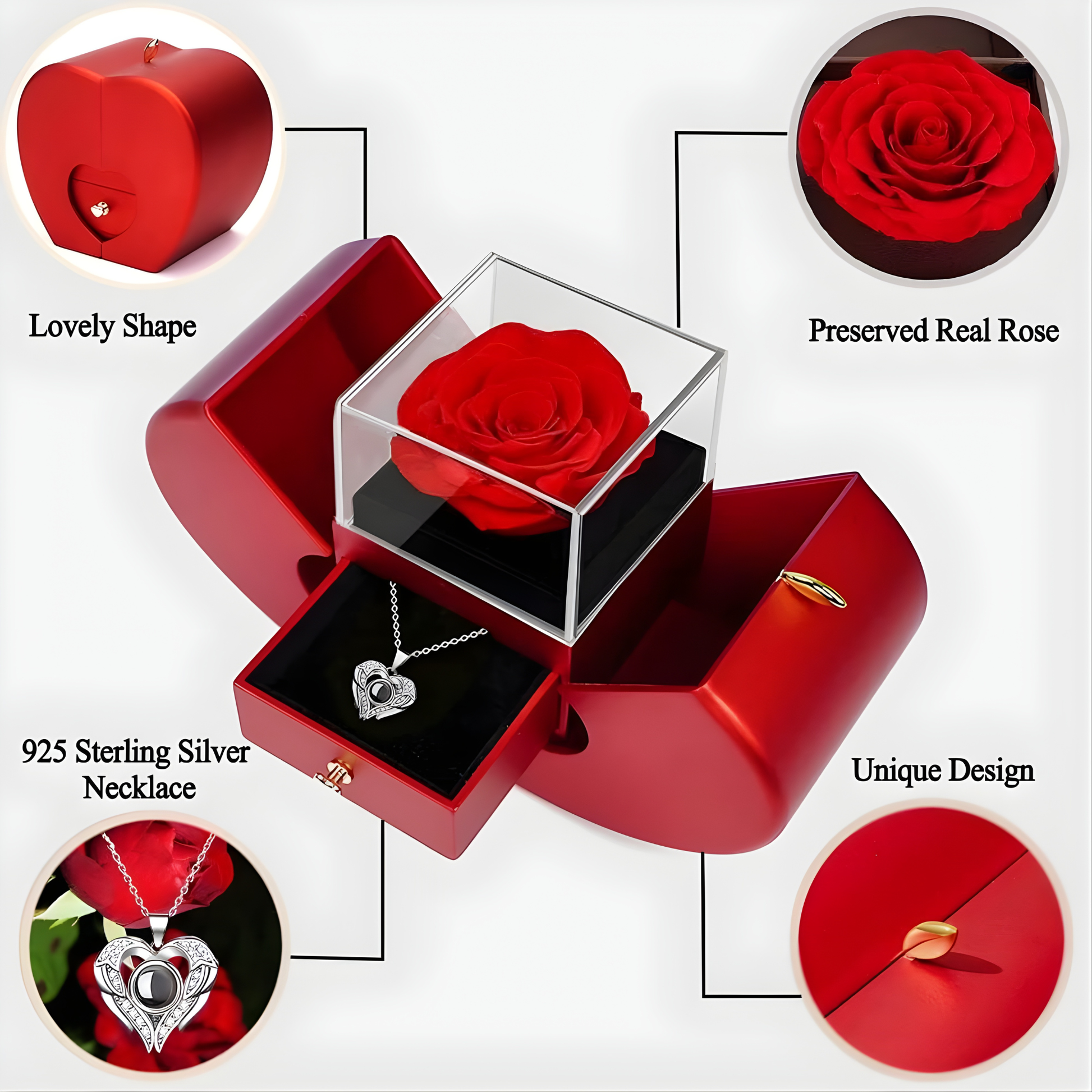 La rosa natural preservada mantiene su belleza durante años sin marchitarse, mientras que el colgante revela “Te amo” en 100 idiomas al mirarlo de cerca. Una forma especial de decir lo que a veces no se puede expresar con palabras.