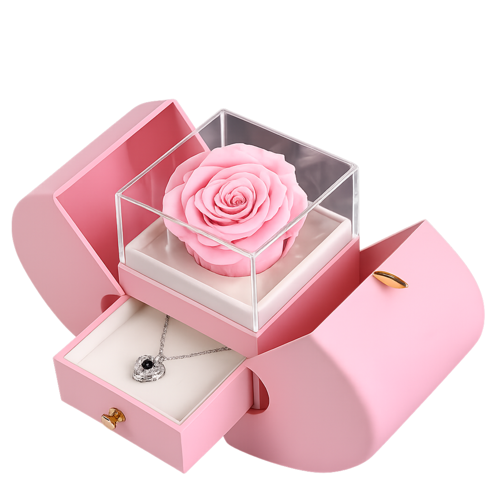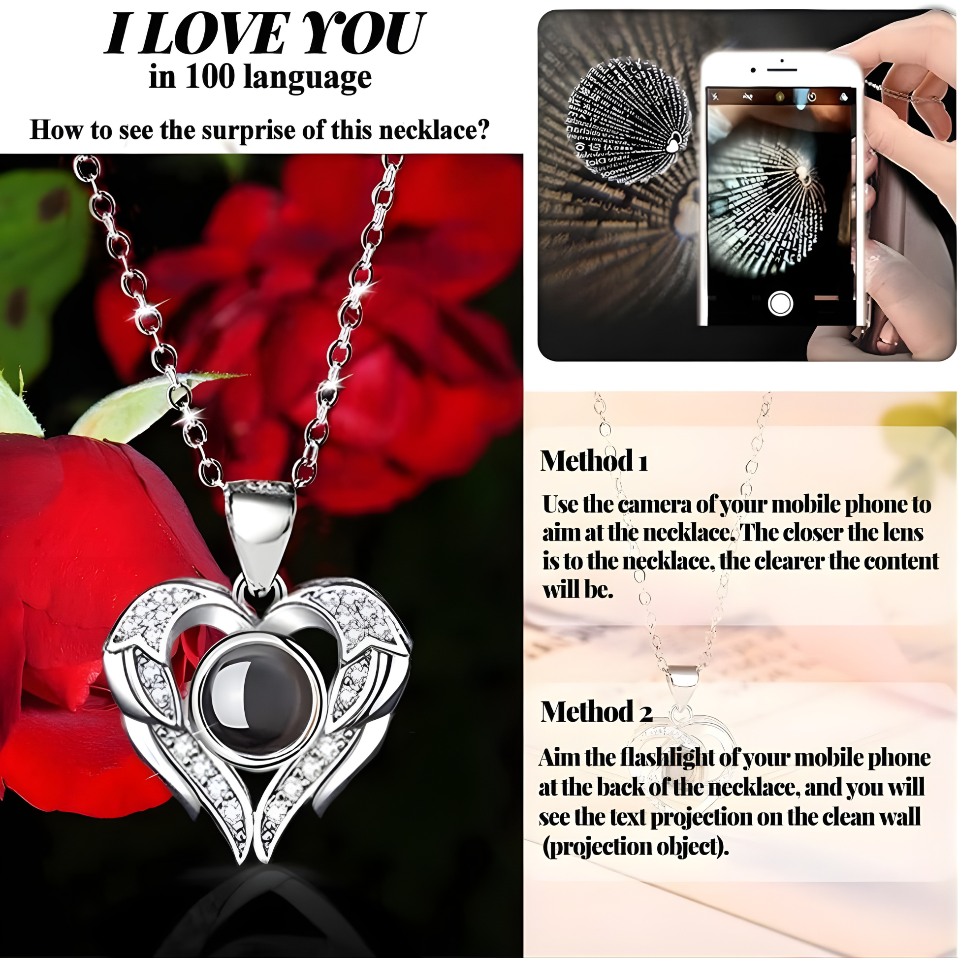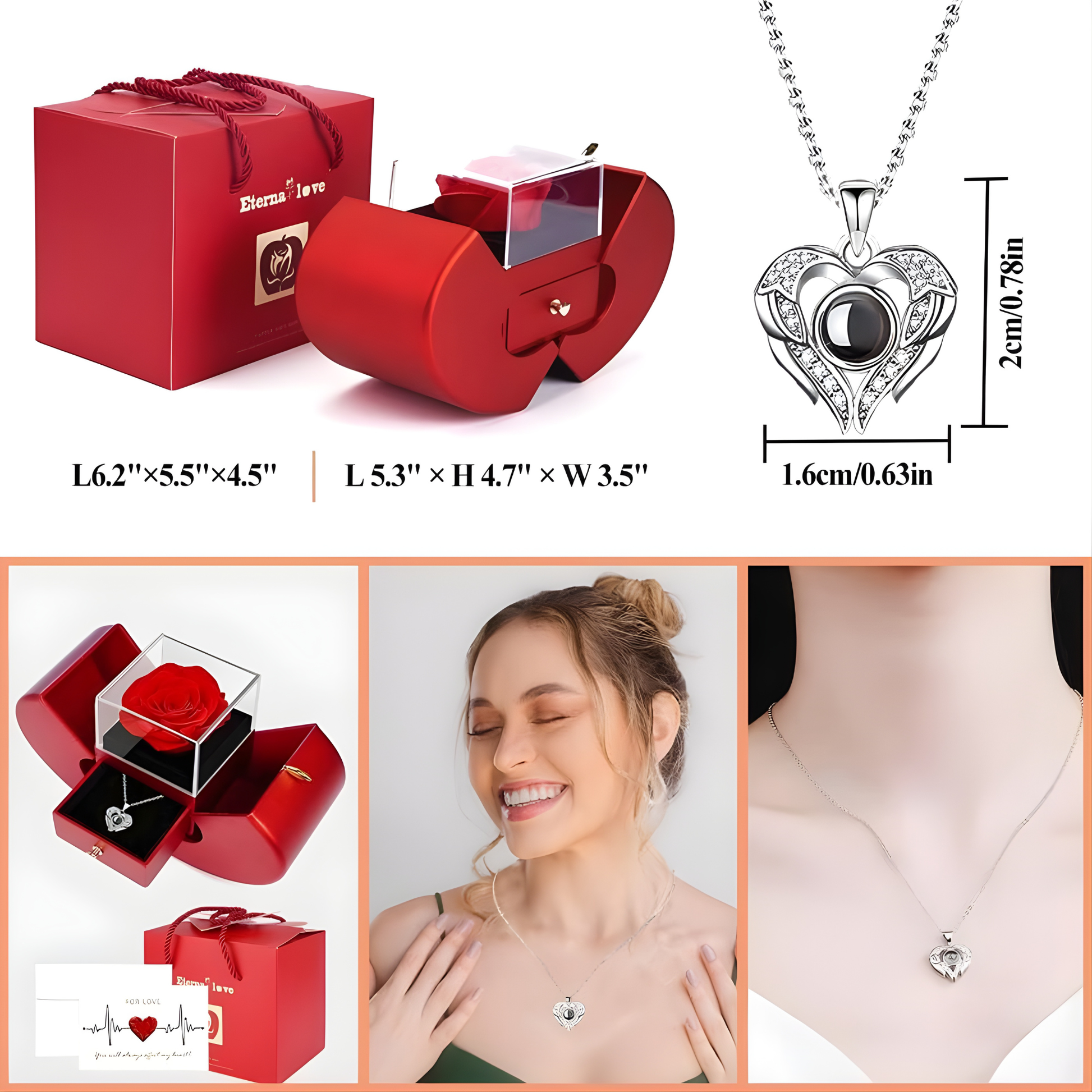 La rosa natural preservada mantiene su belleza durante años sin marchitarse, mientras que el colgante revela “Te amo” en 100 idiomas al mirarlo de cerca. Una forma especial de decir lo que a veces no se puede expresar con palabras.