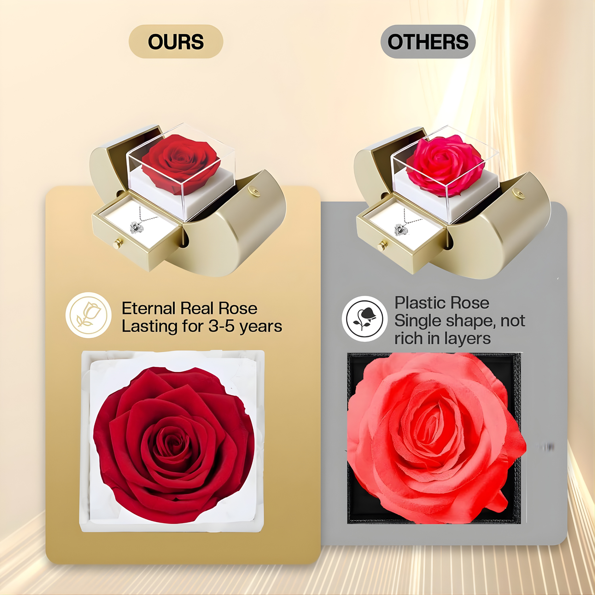 - 🌹 Rosa real preservada que no se marchita: dura 3–5 años sin riego ni cuidados.